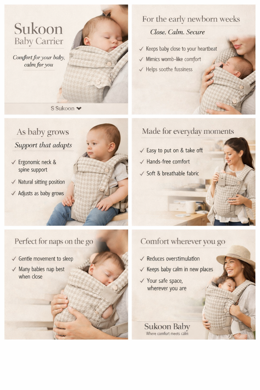 Designed to support healthy hip development, the Sukoon Baby Carrier offers three ergonomic positions: